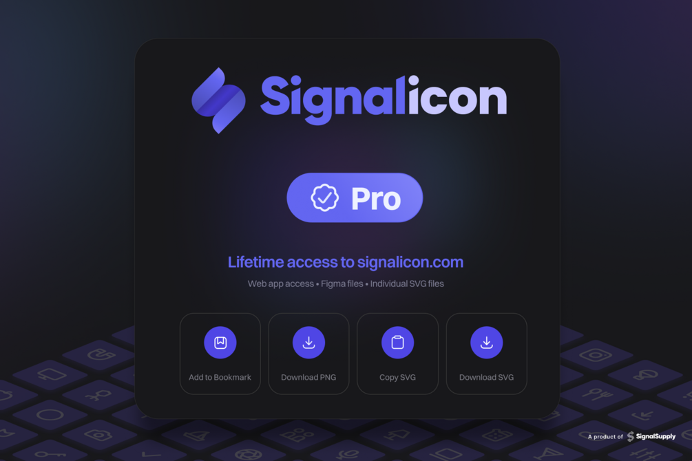 Access to signalicon.com web app for a lifetime, forever. Search icon, easily copy or download a single SVG icon, download all SVG icons, and bookmark your frequently used icons.