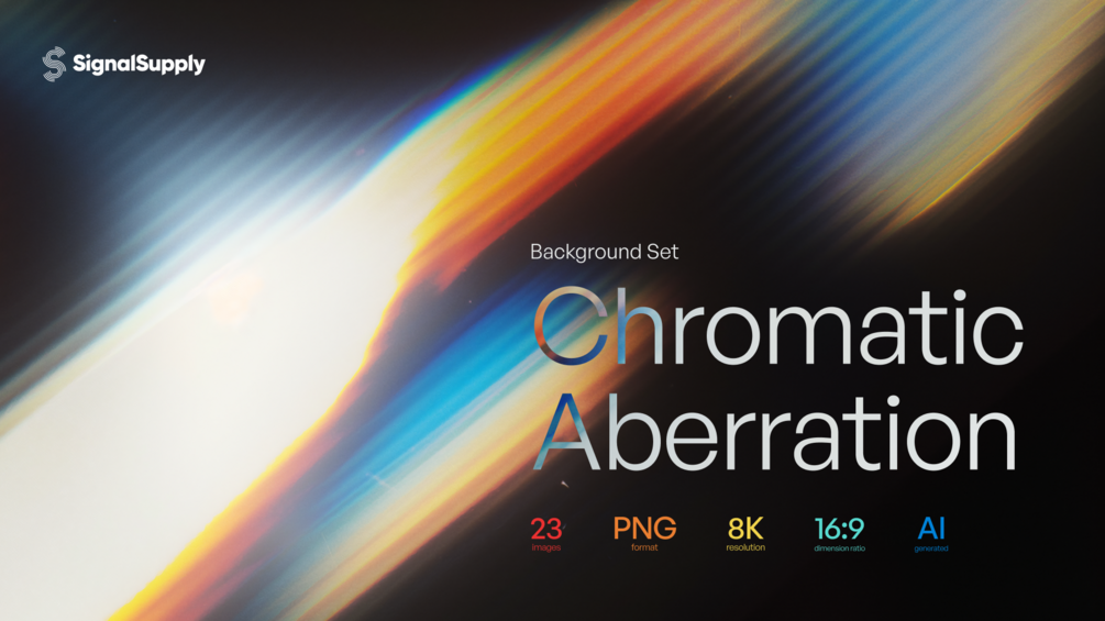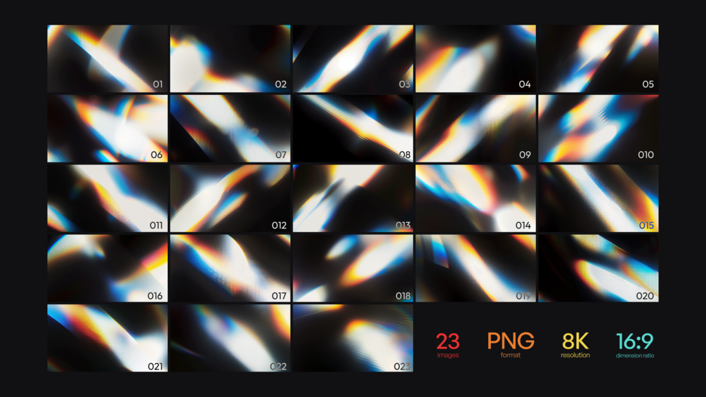 A set of 23 AI-generated chromatic aberration backgrounds, with a 16:9 ratio, 8k dimension, PNG format.